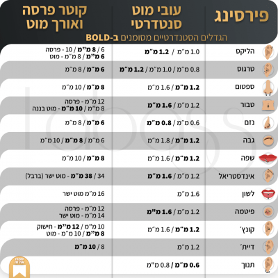 טבלת מידות עגילי פירסיניג, לשימושכם: